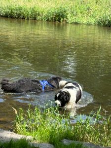 Weiter vorn nähern sich zwei Spielfreunde. Mietze nimmt Tempo auf. Ulla geht das Treffen in der üblichen stoischen Ruhe an. Schnuppern, mal kurz die Pfote auf den Rücken gelegt, damit klar ist, wer das Sagen hat hier … und weiter geht’s. Aber Ulla hat inzwischen gegen den erklärten Willen vom Frauchen spontan eine weitere Badepause eingelegt. Am Steilhang ins Wasser, Platsch in die Strömung.