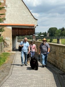 Von hier aus gingen nun 12 Teilnehmer mit immerhin 4 Hunden frohgelaunt an den Start – das Wetter meinte es gut und vor allem gings bergab – vorbei an einigen kulturellen Höhepunkten, die vom sachkundigen Wanderführer ausführlich erläutert wurden – wie die Burg Osterstein, oder das was davon übrig ist, die Marienkirche und das Geburtshaus von Otto Dix – jedem gelernten DDR-Bürger ein Begriff. Die für die Bundesgartenausstellung angelegten Parks konnten leider nur am Rande gestreift werden. Auch der Universalgelehrte und Tierschützer Karl Theodor Liebe, den zwar kaum jemand kennen dürfte, der aber ein liebevoll gepflegtes Denkmal am Wegesrand hat, wurde besucht und schließlich kam der Höhepunkt für die wasserbegeisterten Neufundländer – das Bad in der Weißen Elster. Es wurde fleißig fotografiert. Dann mussten wir allerdings dem Ernst des Lebens ins Auge schauen und den Weg zurück, also bergauf, antreten. Erschwerend kam hinzu, daß sich unser Guide mangels Internetempfang (!) etwas in seiner Route verheddert hatte, sodass auch Querfeldein-Wege von nicht unbedeutender Steilheit gemeistert werden mussten. Eine Teilnehmerin quälte sich trotz gesundheitlicher Beschwerden heldenhaft über die kräftezehrende Strecke, es wurde ausgiebig der Bau provisorischer Nottragen – die sich im Übrigen auch gut für Neufundländer eignen würden, diskutiert. Wahrscheinlich wird dazu bald eine Bauanleitung im Internet erscheinen. Aber alles ging gut aus und am Ende konnten sich alle Zwei- und Vierläufer in der Waldgaststätte erfrischen und stärken. Der Tag war jedoch noch nicht zu Ende. Zum Entsetzen der ohnehin schon angeschlagenen Teilnehmerin stellte sich jetzt heraus, dass deren Telefon verschwunden und höchstwahrscheinlich unten am Elsterufer zurückgeblieben war. Nach vielen mehr oder weniger hilfreichen Kommentaren kam jemand auf die Idee, das Handy einfach mal anzurufen – und siehe da, das Gerät antwortete oder vielmehr der ehrliche Finder, der das Klingeln gehört hatte. Zu allem Überfluss haben die beiden jungen Leute das Telefon sogar zu uns auf den Berg gebracht – große Erleichterung und ein weiterer Grund zum Feiern!